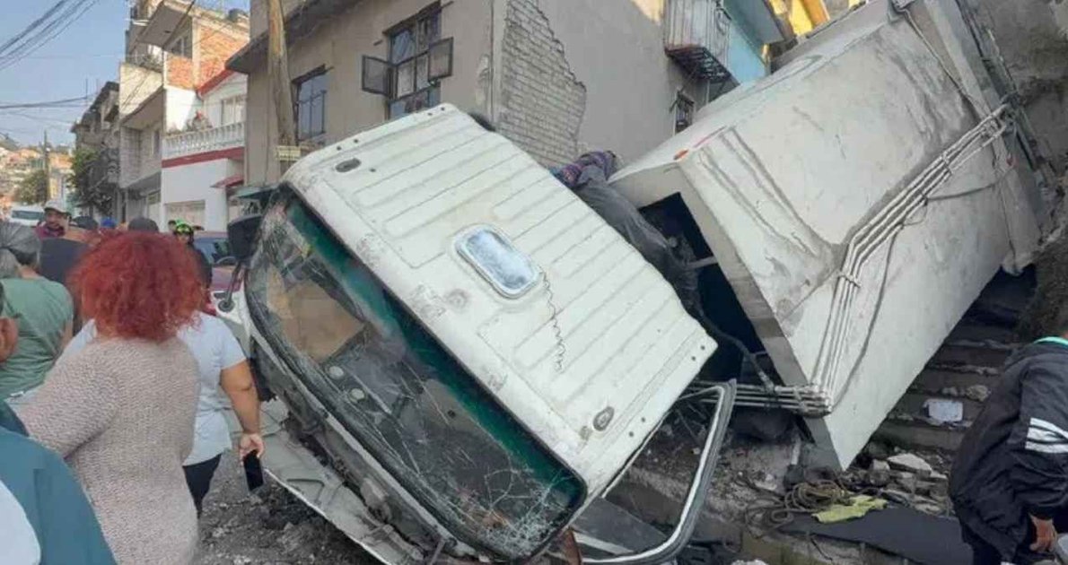 El suceso ocurrió alrededor de las 10:00 horas, cuando el camión descendía por la Avenida 20 de Noviembre, cerca del cruce con Calvario. Según los primeros reportes, la unidad perdió los frenos y avanzó sin control, derribando jardineras y un muro de concreto antes de caer sobre unas escalinatas peatonales, afectando al menos tres casas a su paso.