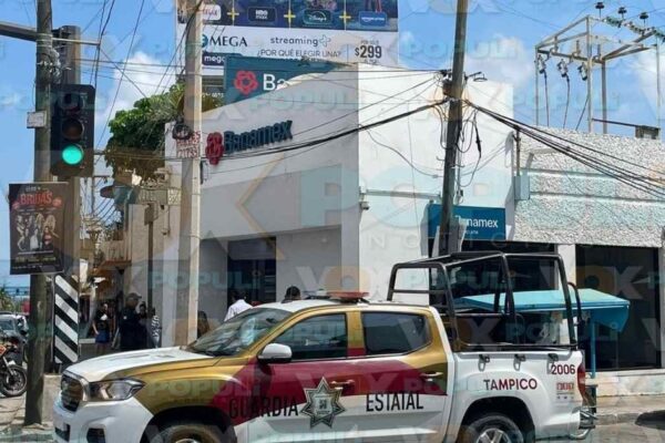 Dos hombres armados asaltan un banco en Curva Texas, Tamaulipas, sometiendo a clientes y empleados antes de huir en taxi. La policía investiga el caso.
