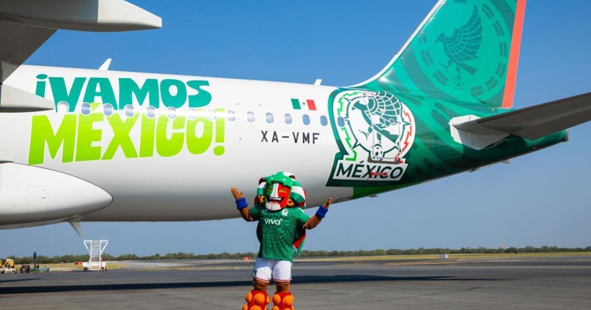 El airbus 320, operado por la aerolínea mexicana Viva Aerobus, tiene una capacidad para más de 180 pasajeros y está diseñado para alcanzar velocidades de hasta 900 kilómetros por hora. La frase ‘Viva México’ se puede leer en la zona de las ventanillas, reafirmando el espíritu nacional que este avión representa.