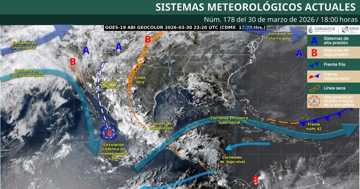 Este lunes 30 de marzo de 2026, se espera un clima inestable en varias regiones de México, con pronósticos de lluvias fuertes y caída de granizo, según informan la Comisión Nacional del Agua (Conagua) y el Servicio Meteorológico Nacional (SMN). Las condiciones meteorológicas estarán marcadas por una circulación ciclónica y una vaguada en altura que se desplazarán sobre el occidente y norte del país, interactuando con una línea seca y canales de baja presión.