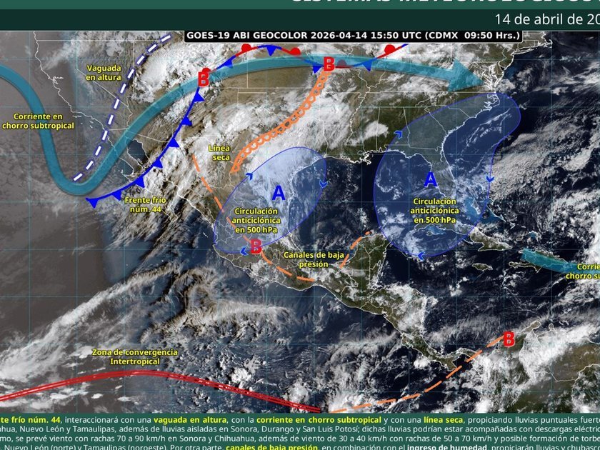 Este miércoles 15 de abril de 2026, México experimentará condiciones climáticas extremas debido a una onda de calor y la llegada del frente frío número 44, según el informe del Servicio Meteorológico Nacional (SMN). Mientras que una circulación anticiclónica en niveles medios de la atmósfera generará temperaturas elevadas en nueve estados, el norte y noreste del país enfrentarán lluvias, vientos fuertes y posibles tornados.
