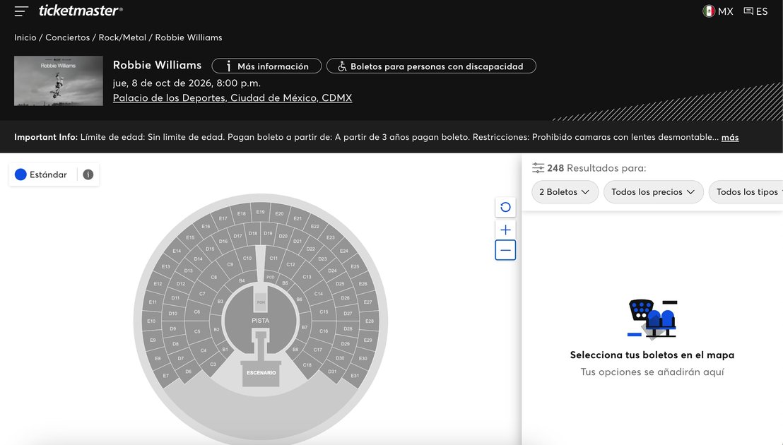 Los precios de las entradas oscilan entre los 1,736 pesos y los 4,154 pesos, ya con cargos incluidos. Esta estructura de precios refleja el interés continuo en las presentaciones de Williams, a pesar de que su popularidad no es la misma que en los años 2000, cuando lanzamientos como Rock DJ y Feel dominaron las listas de popularidad en todo el mundo.